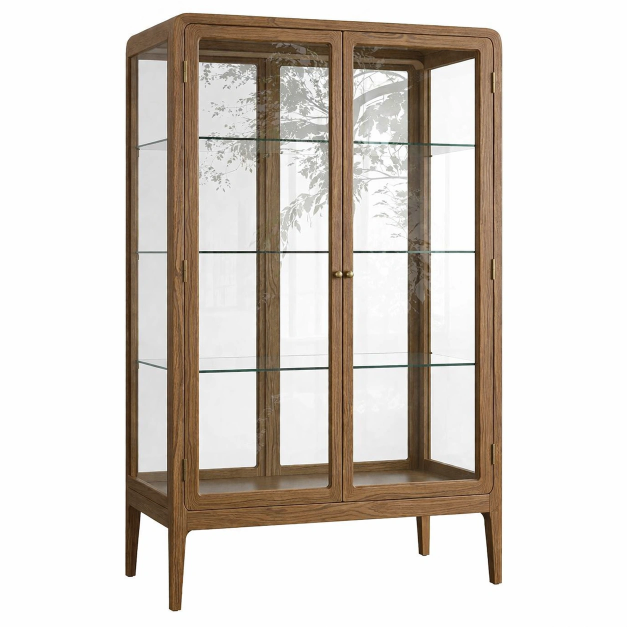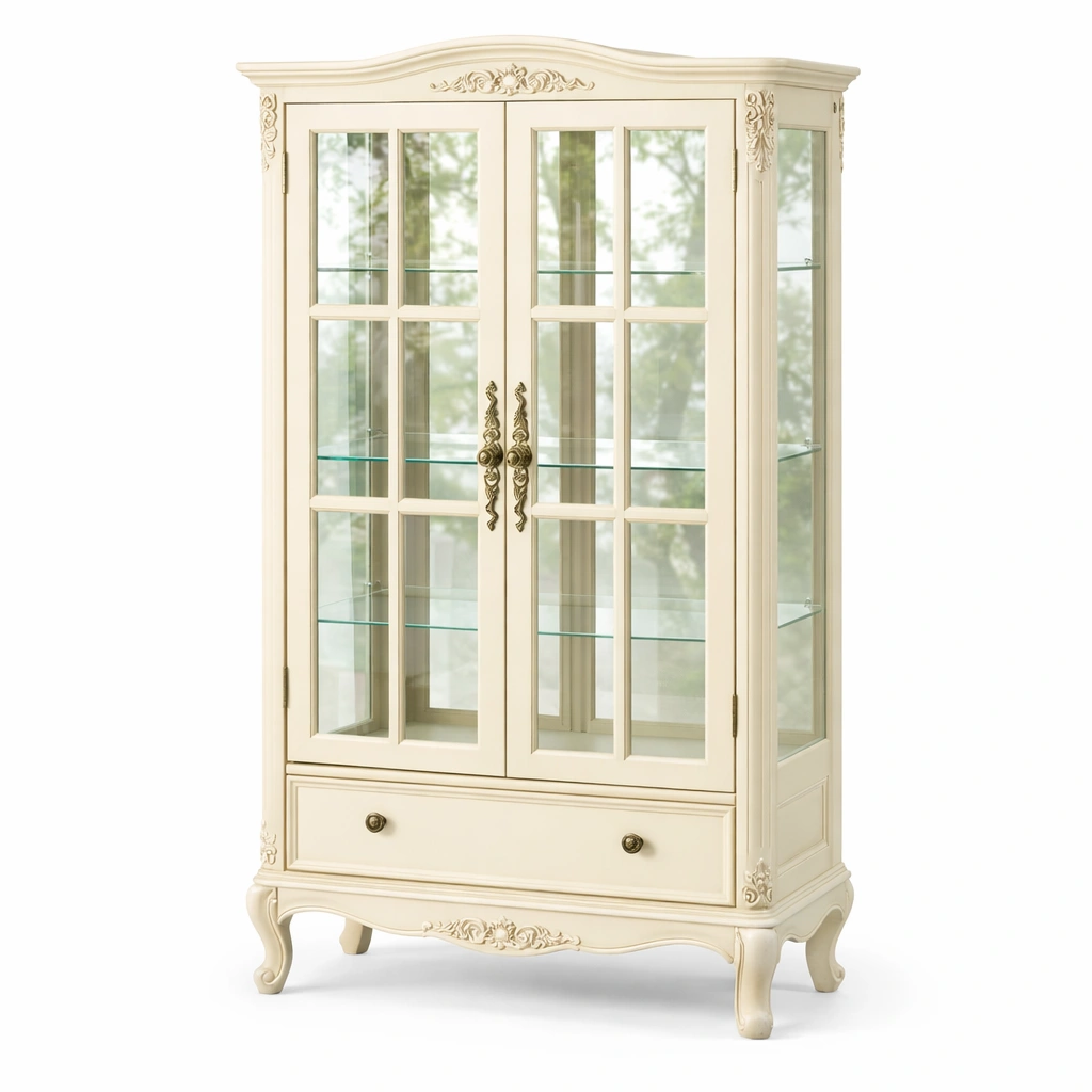 Vitrina de madera crema con estantes de vidrio templado