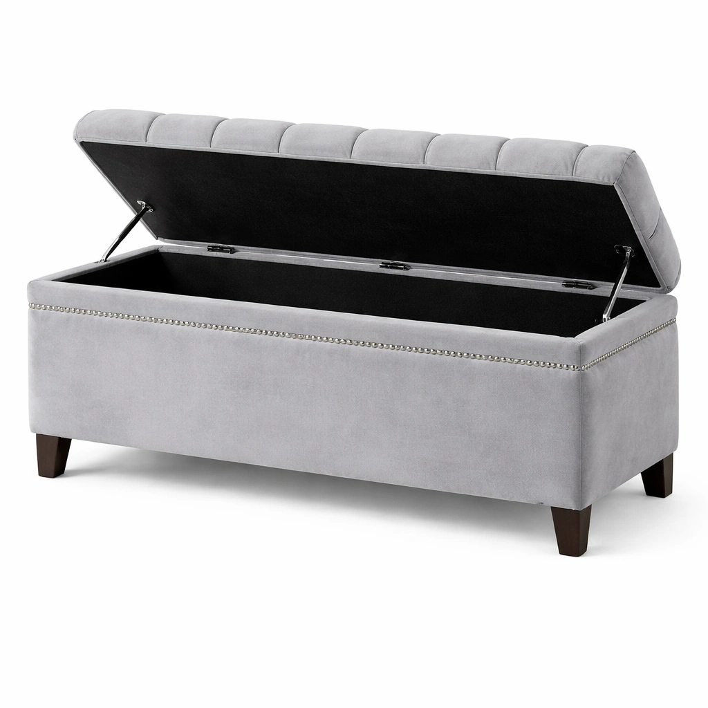 Este banco de almacenamiento está fabricado en tejido de poliéster gris, con una estructura interna de madera maciza para garantizar su durabilidad. Sus medidas son 120 cm de largo, 45 cm de ancho y 45 cm de alto, ofreciendo una capacidad de almacenamiento de aproximadamente 80 litros. La tapa incluye bisagras de apertura suave, y las patas de madera proporcionan alta estabilidad. Para su mantenimiento, basta con limpiar con un paño húmedo.