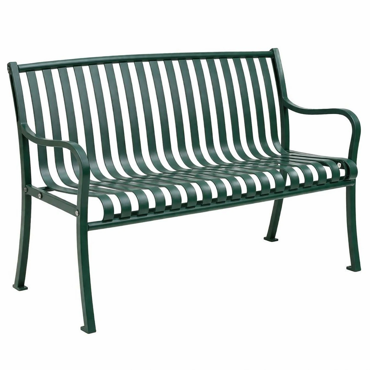 Banco fabricado en acero con recubrimiento en polvo de color verde. Dimensiones: longitud 120 cm, anchura 60 cm, altura 80 cm. Peso neto: 15 kg. Apto para uso exterior. Limpieza con un paño húmedo.