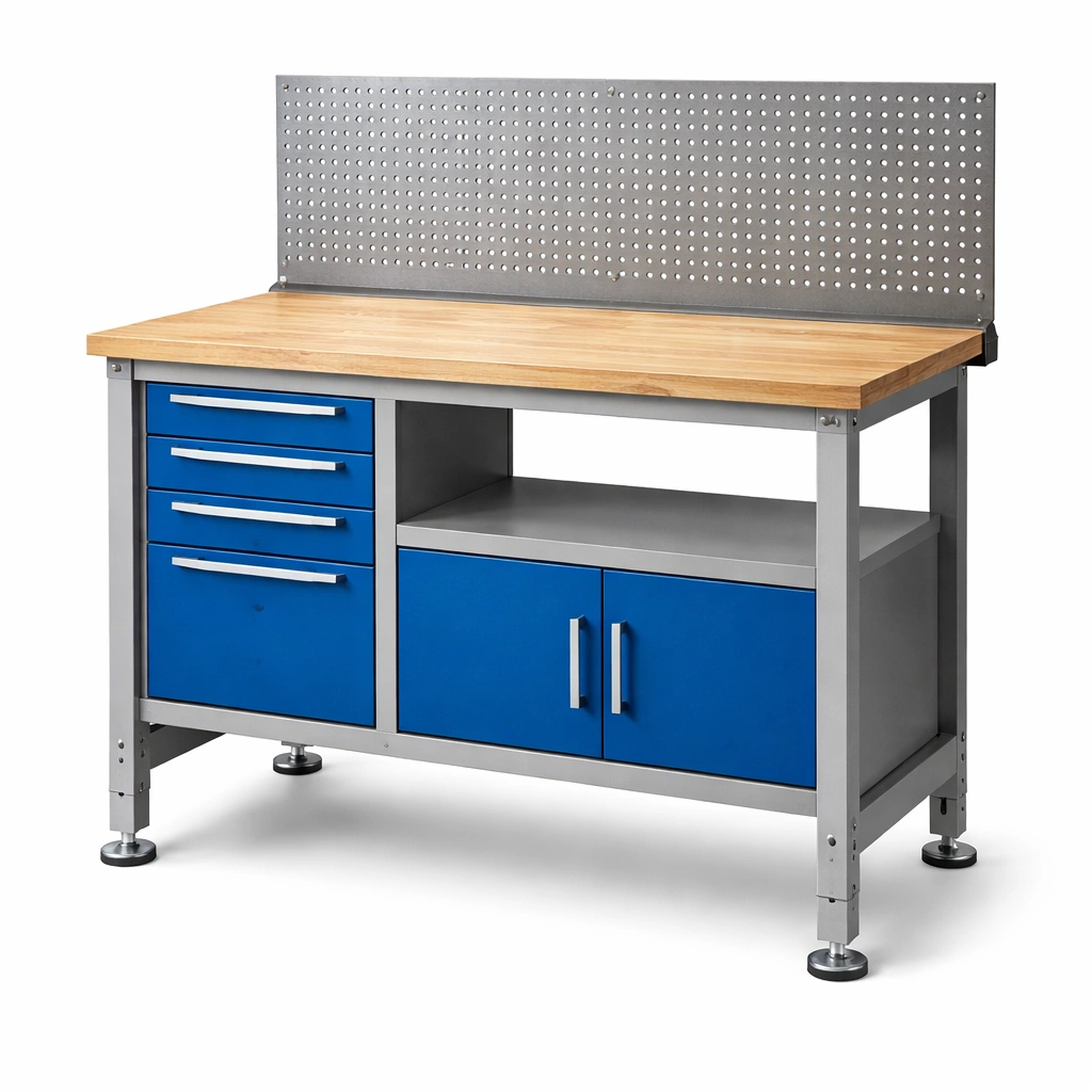 Incluye 4 cajones, 2 puertas, y un panel perforado para herramientas.